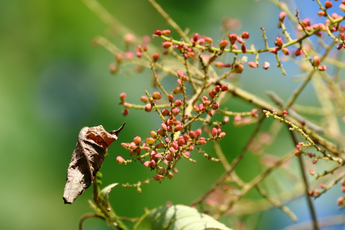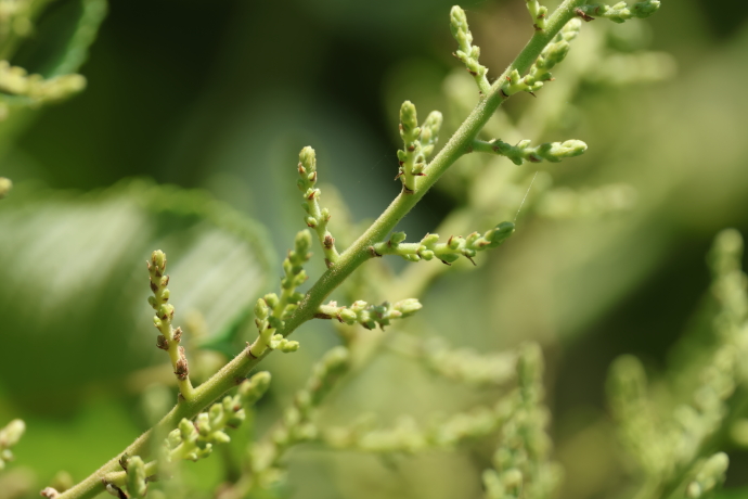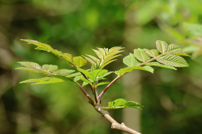 冬芽が展開し、新枝が伸びています。新枝には複葉が互生し、小葉や葉柄は淡緑色で赤みを帯びています。新枝の先端から円錐花序を出しますが、まだこれからのようです。