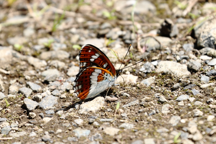 森の小道の上で地面をつついていました。翅裏が確認できます。翅裏は橙色の地に黒色の点状模様や白斑が帯状に並び、黒褐色を地とする翅表とは印象が異なります。