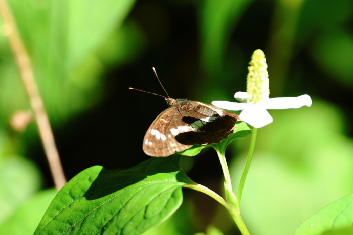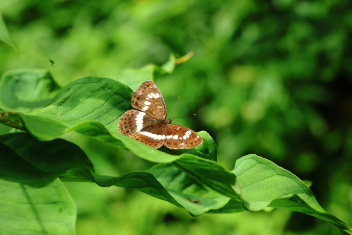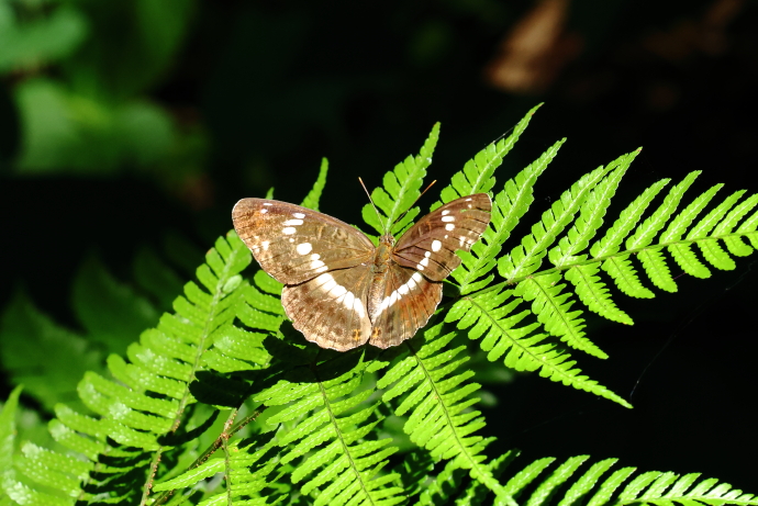 シダの葉の上で休んでいます。羽ばたきを中心に滑空せず、直線的に飛び、葉の上で静止します。コミスジチョウのように滑空しないため、飛翔時の識別に役立ちます。