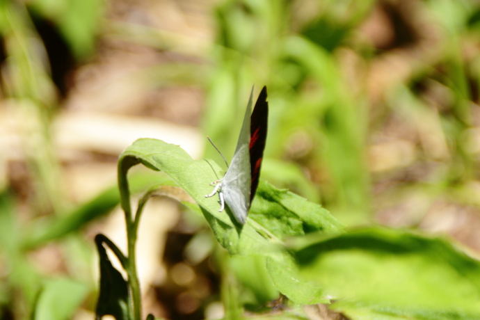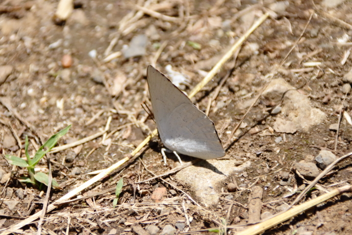 森の小道の真ん中に、翅裏が真っ白な蝶がいます。なかなか翅を広げず、翅表を確認できません。翅裏は銀白色で模様がなく、この様子が名前の由来になっています。