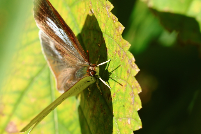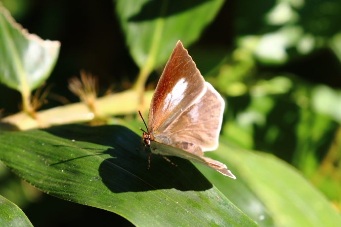 少し翅を広げてくれました。濃褐色地に赤橙色の模様が覗きます。オスとメスでは翅表の模様が異なり、こちらはオスです。残念ながら翅を全開にはしてくれませんでした。