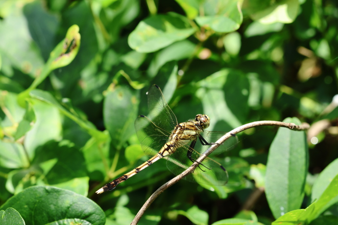 成熟したメスです。体色はムギワラ色で、別名「ムギワラトンボ」と呼ばれます。未成熟のオスとの区別は難いですが、複眼は緑色で、腹部先端には尾毛があり3裂状です。