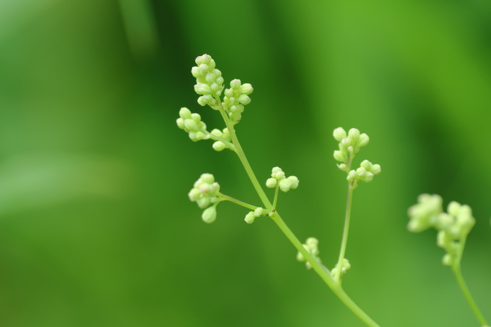 よく分岐する茎の先に円錐花序をつくります。蕾は4枚の萼片に包まれ、まだ丸いままです。開花すると萼片はすぐに落ち、雄しべと雌しべだけの裸の花が顔を出します。