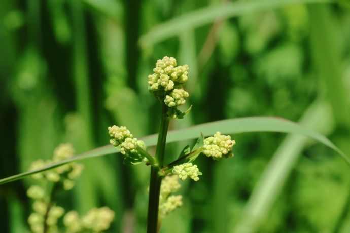 茎頂および葉腋から花芽が出てきました。これから暑い盛りに花序を伸ばし、秋にかけて花が咲きます。よく似たカラマツソウは夏に咲くため、識別のポイントになります。