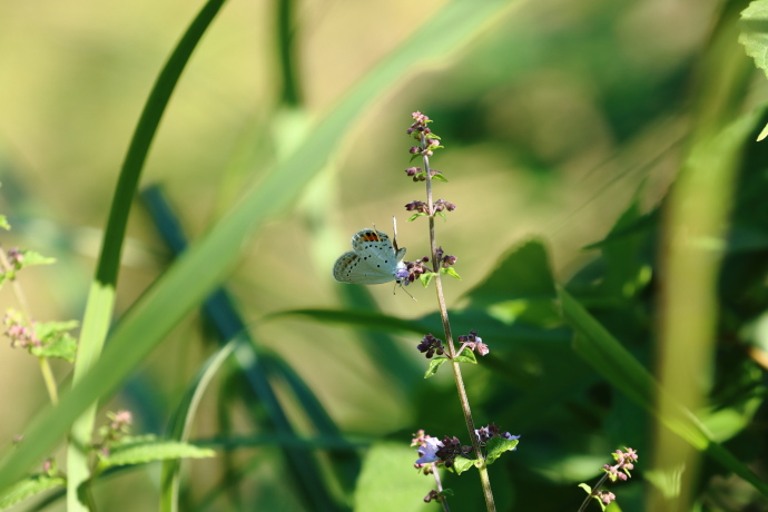 そろそろ花の季節も終わりでしょうか。花弁が落ち、赤褐色の萼が目立ちはじめました。一匹のツバメシジミが飛来し、名残惜しげに花蜜を探していました。
