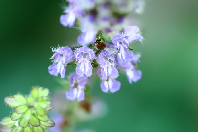 花は唇形の合弁花で、白い柔毛に覆われています。上唇は帽子状で、下唇は三裂して広がります。雄しべは2本で、上唇に添って突き出ており、青紫色の葯が目立ちます。