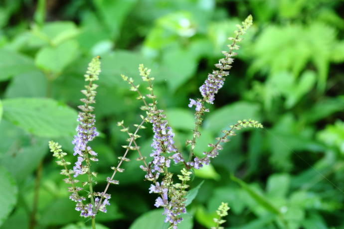 茎の先は分枝し、長い花穂を伸ばします。花穂には花が輪生し、階段状に並んで、青紫色の花をたくさん咲かせます。変異により、花冠が白色の品種も確認されています。