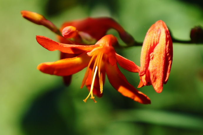 花冠は鮮やかな橙赤色で、先端は6裂し、基部は筒状に合着します。雌しべ1本、花柱は3裂し、先端がさらに2裂。雄しべ3本で、雌しべとともに花冠から突き出ています。