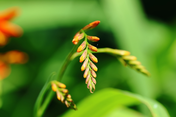数回枝分かれした花茎の先に穂状花序を形成しています。蕾は花軸に直接付き、2列性で左右交互に並んでいます。基部の蕾は大きく膨らみ、下から順に咲き上がっていきます。
