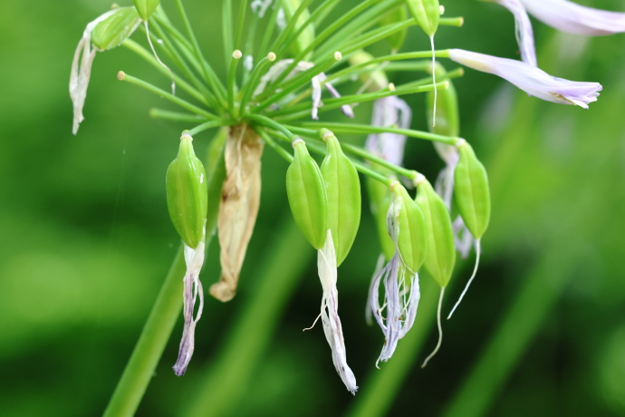 膨らんだ子房が目立ち始めました。萎んだ花弁や雌しべ、雄しべがまだ残っています。果実は3室の蒴果。中で黒い種子が育ちます。子房のない花柄も多く見受けられます。