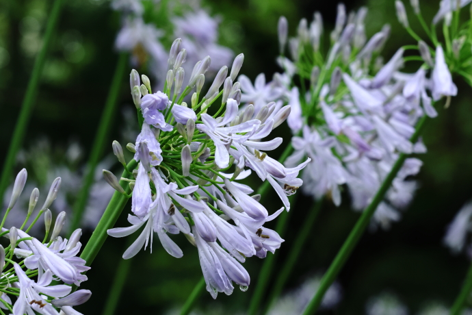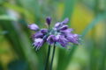 花が咲き始めました。花序は散形花序。花茎が四方に伸び、紫色の花がなんとも涼しげです。全体が円形に広がり、まるで夏空に咲く打ち上げ花火のように見えます。