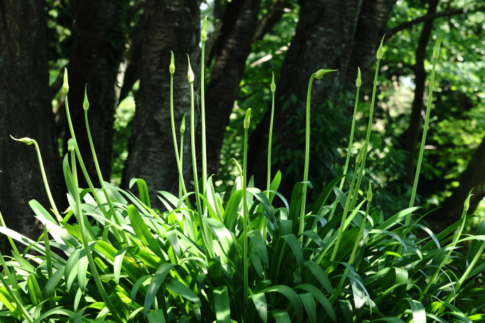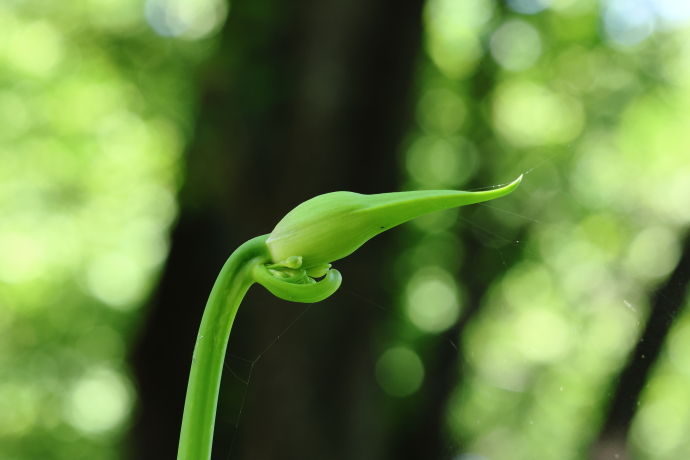 苞の中には、たくさんの蕾が詰まっています。こちらの一本は苞が割れ、蕾が少しだけ姿を現しました。これから花茎が放射状に広がり、たくさんの花を咲かせます。