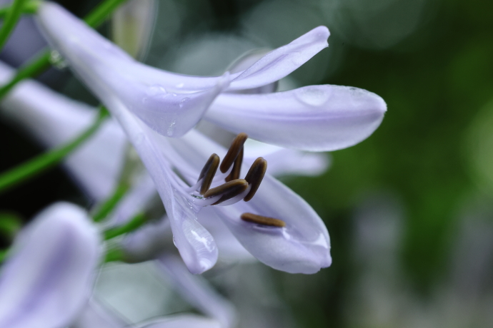 花冠は漏斗形で、先が6深裂。花被片の中央には、濃い紫色の縦筋が入っています。雄しべ6本、雌しべ1本。いずれも花冠から飛び出し、途中でやや曲がって上を向いています。