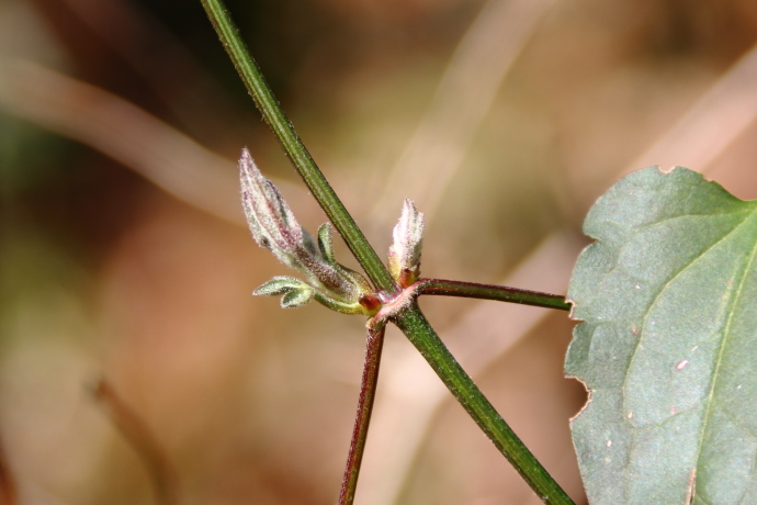 葉腋から新枝が展開しています。下部では、対生に出た葉柄の基部が合着し、茎を包んでリング状になっています。本種は常緑性で耐寒性が強く、冬も葉をつけています。