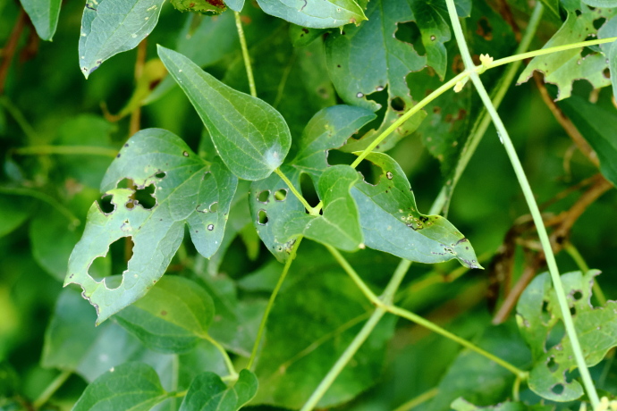 葉は奇数羽状複葉で、小葉は全縁。下部の葉は切れ込むことも。蔓性で葉柄は曲がりくねって長く、他物に絡みます。小葉の間隔が長く、複葉と分かりにくい印象を与えます。