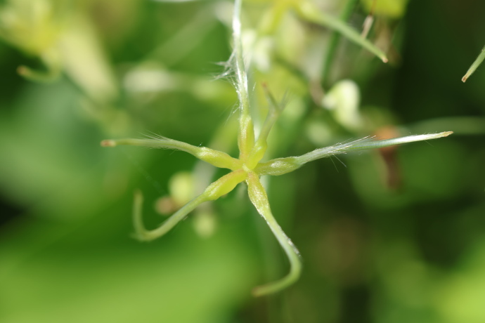 果実を確認しました。橙黄色の痩果が数個まとまり、先端には白色の長毛が見られます。花柱は羽毛状に変化し、仙人のひげに似ていることが名前の由来です。