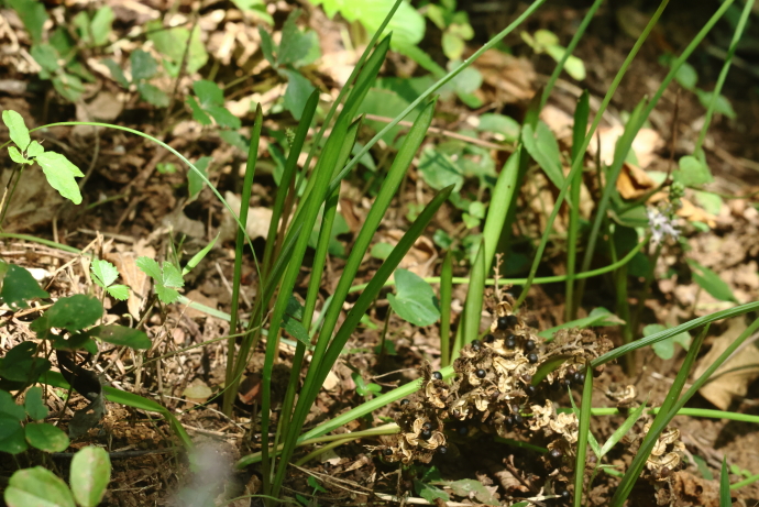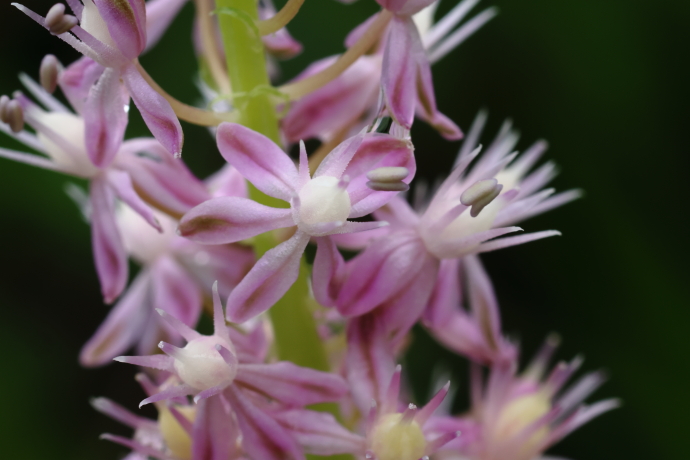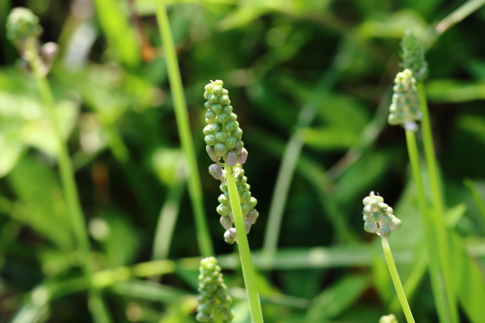 皮を剥くとつるつるとする鱗茎が、名の由来のひとつとされています。その鱗茎から花茎が伸び、先端に白っぽい花序茎を出します。花序は下部から順に咲き上がります。