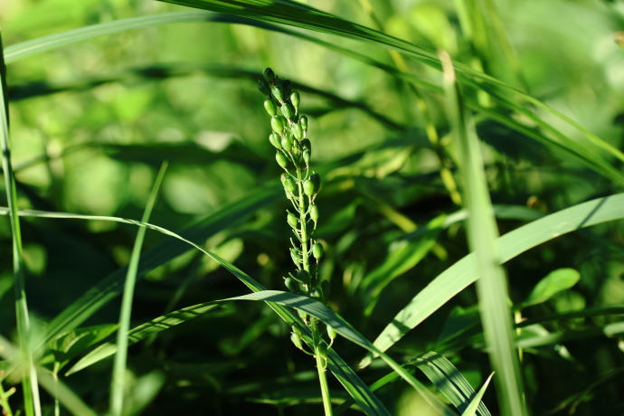 花穂には蕾がぎっしりと詰まっています。葉の間から花茎が伸び、総状花序を形成します。花の密度が高く、花柄が短いため、一見すると穂状花序のようにも見えます。