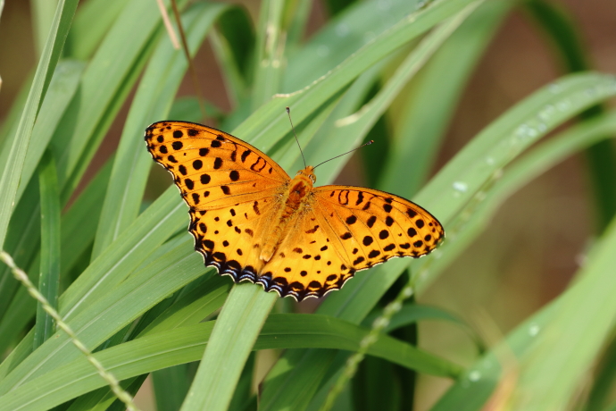 オスの翅表は、全体に橙色を地色に黒い斑点が散在するヒョウ柄で、外縁に沿って小さな黒斑が列状に並んでいます。縁と黒斑の間には白または青味を帯びた線があります。