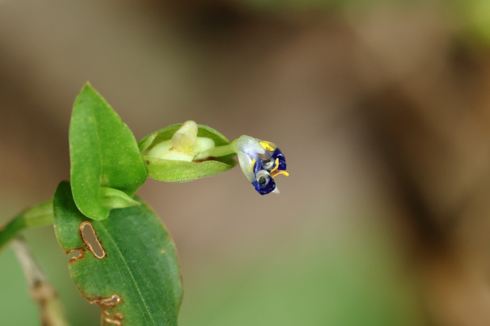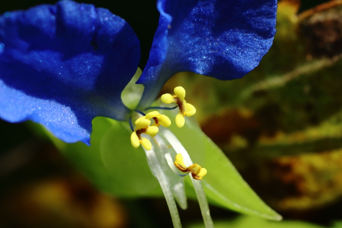 花は蝶形で、上に大きな青い花弁が2枚、下に小さな白い花弁が1枚あります。花弁近くに仮雄しべがあり、その先と外側に雄しべが突き出し、雌しべも外へ伸びています。