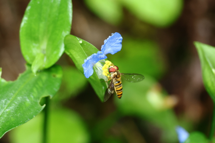 朝に咲き、昼には萎む様子を朝露に例えたのが名の由来です。時刻は今、午後1時30分頃。すでに閉じています。花が萎む際、雄しべと雌しべが近づき、自家受粉を促します。