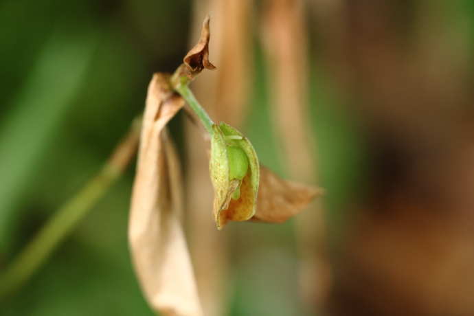 茎先の苞葉の中に果実が見えています。苞葉は左右に開いた舟形で、花後には閉じて果実を包み込みます。果実は蒴果で、熟すと2片に裂開して種子を放出します。