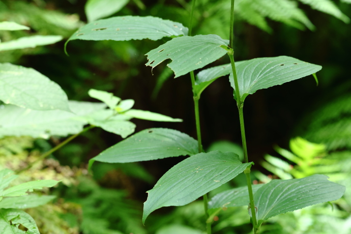 葉は互生し、縁は全縁で、基部側がやや波打ちます。基部は茎を抱き、先端は短く尖ります。葉脈は並行脈で、2本の茎が同じ方向に葉を付けて並び立つ様子が印象的です。
