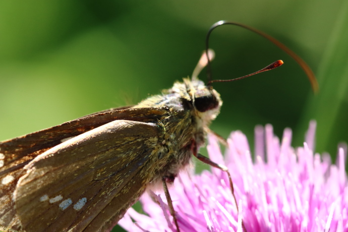 田の周りの土手でよく見かけます。幼虫はイネ科やカヤツリグサ科の植物を食草とし、成虫はさまざまな花蜜を吸います。大量に発生し、害虫として扱われたこともあります。