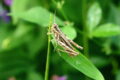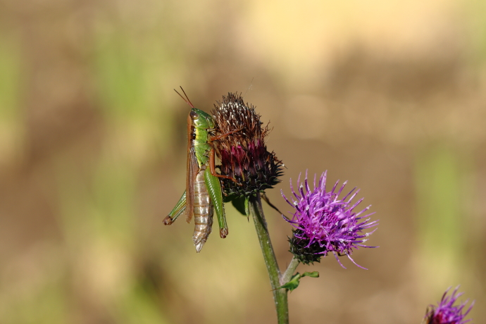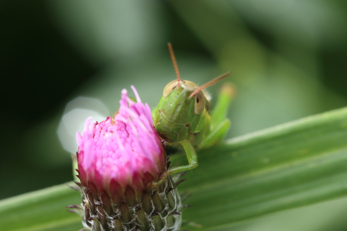 こちらは成虫です。なぜかノハラアザミにしがみついています。体は緑色で、黒線が頭部後方から腹部まで側面を走り、褐色の翅は腹端近くまで伸びています。