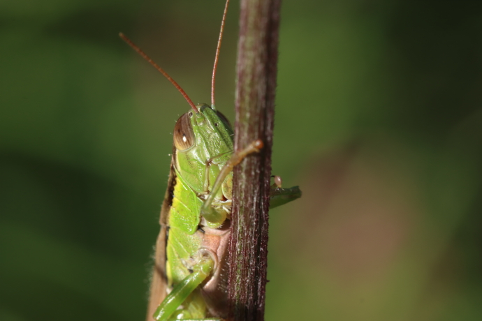 草の茎にしがみついています。複眼は紅褐色で、縦の線が入っています。赤褐色の触角2本が頭部中央から伸び、複眼と触角の間には、3つある単眼のうちの1つが見えています。