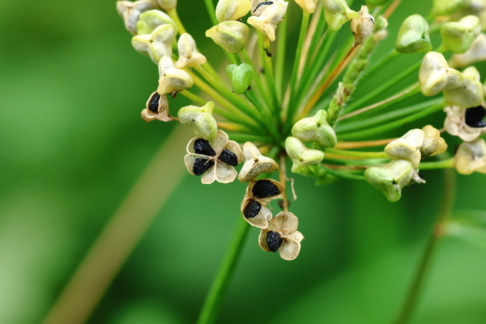蒴果は各室の背側から裂開し、3つの部屋に扁平な黒い種子が乗っています。隣には、裂開前の蒴果や、裂開して一つ二つの種子をすでに落としている蒴果もあります。
