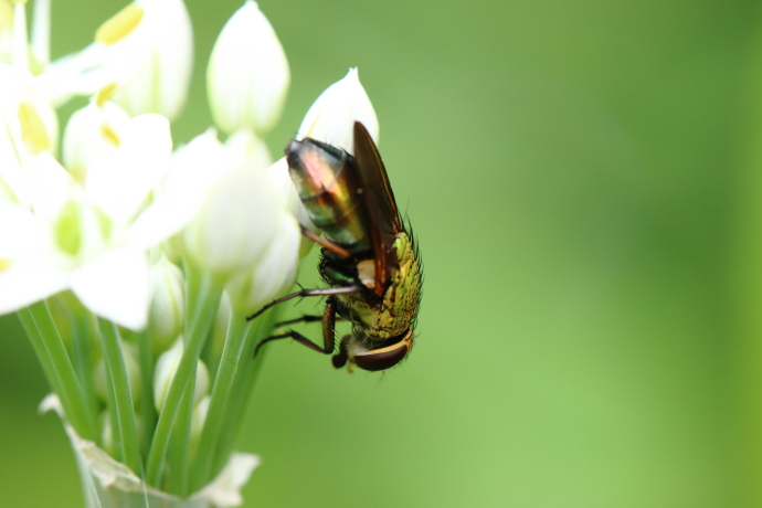 クロバエ科の仲間ですが、本種の食性は主に花蜜で、この時期はツルボやニラの花で吸蜜する姿をよく見かけます。吸蜜時には花粉が体に付着し、花粉媒介者となっています。