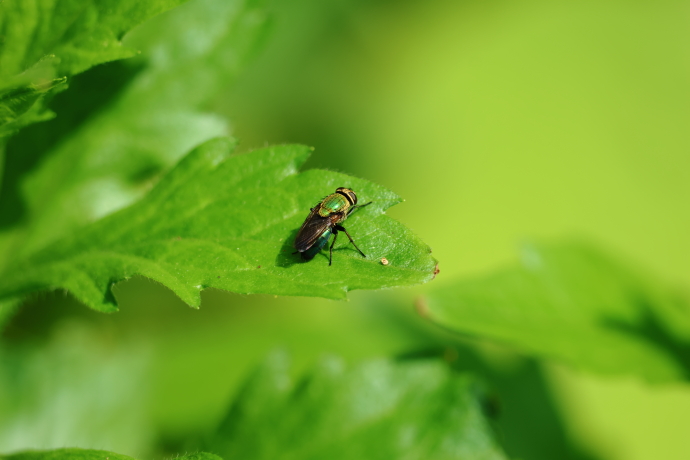 以前は「ミドリバエ」と呼ばれていました。分類が変わり、名称も変更されました。胸背部には黒い剛毛がありますが、金属光沢のある黄緑色で、名前の由来となっています。