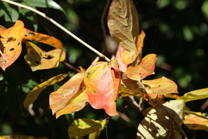 秋が進み、木々が様々に色づいて季節を彩っています。黄色、橙色、赤色のグラデーションが美しく、色鮮やかです。本種では、黒緑色の丸い斑点が葉に見られます。