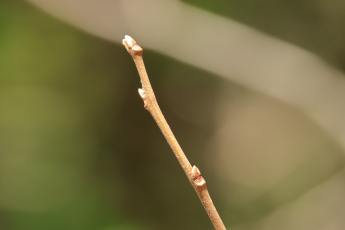 冬芽が出ています。三角形でおにぎり型です。着物を羽織ったお雛様のようにも見えます。赤褐色で軟毛があり、2~3枚の芽鱗が見えます。茎にも軟毛が多くあります。