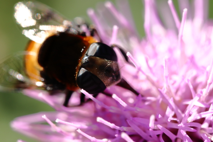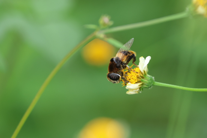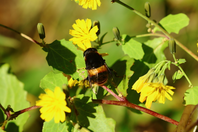 アイノコセンダングサが咲き乱れ、多数のアブ、ハチ、チョウが飛び交っています。ブーンと大きな羽音を立てて目の前に止まりました。一瞬マルハナバチかと思いました。
