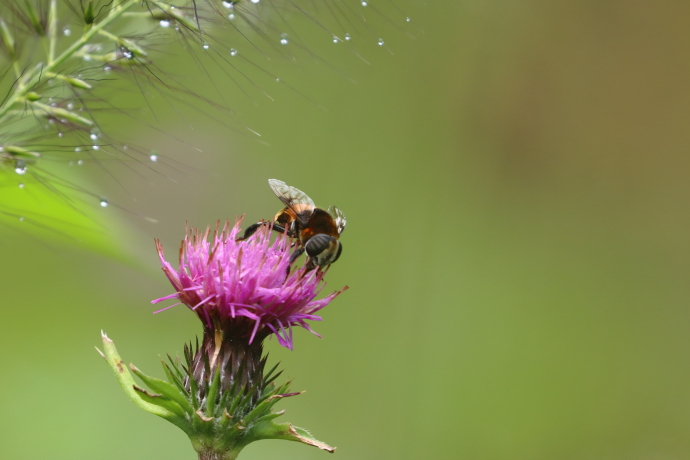 雨上がりです。ノハラアザミに止まりました。後ろのチカラシバに水滴がついて、絵葉書のような一枚になりました。遠くから見ても複眼の中の横縞ははっきり分かります。