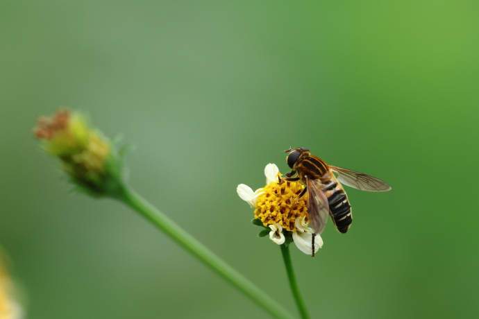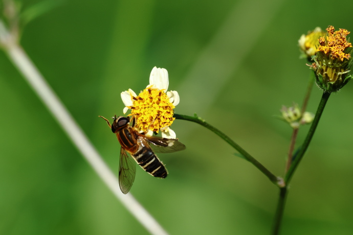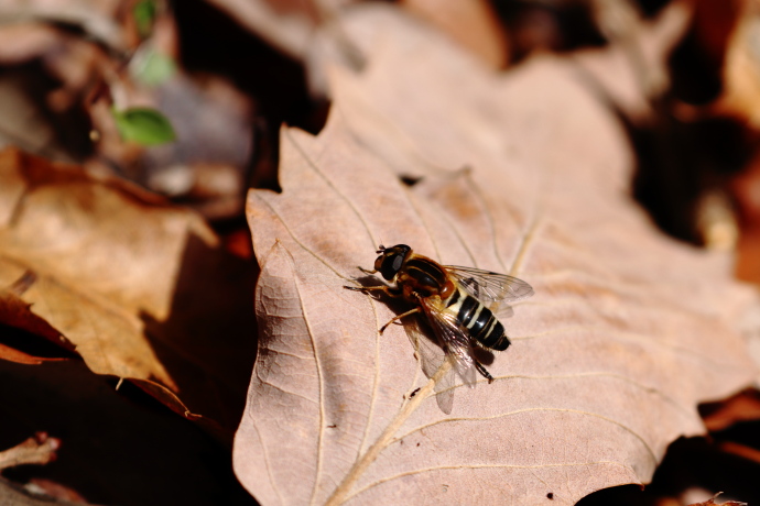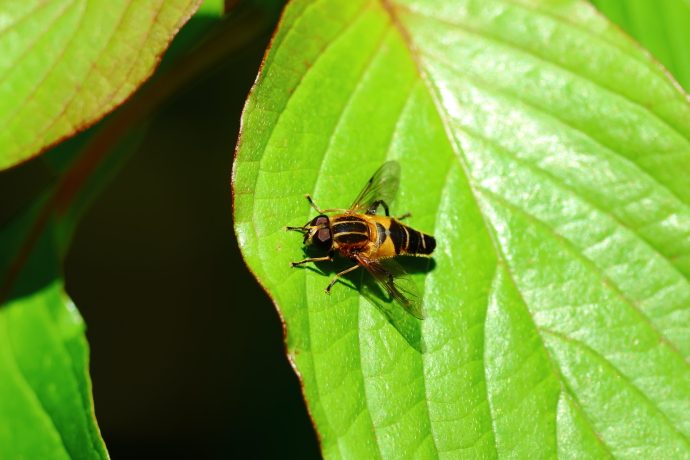 こちらはメスです。個体差はありますが、腹部上部の黄帯が三角状に発達していません。複眼が離れていることからもメスと分かります。オスの複眼は接近しています。