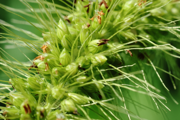 直立した茎の先に円錐花序を伸ばしますが、花序柄が短いため円柱状に見えます。エノコログサに似ますが、花穂(=総)が長く先端が垂れるため、遠目でも識別できます。