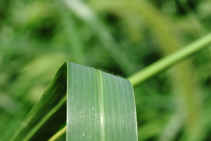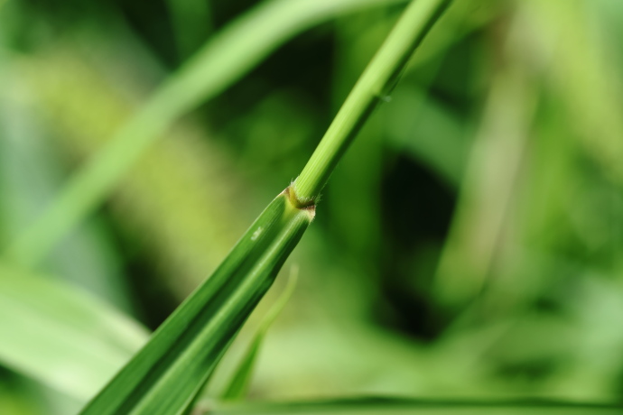 葉の基部は細く柔らかく、鞘口には退化した1列の毛が並ぶだけの葉舌が見られます。エノコログサの葉の基部は円形でしっかりしており、鞘口に短い毛状の葉舌があります。