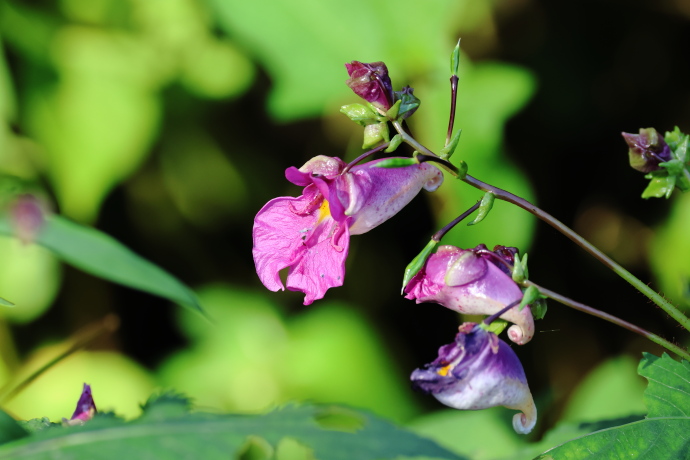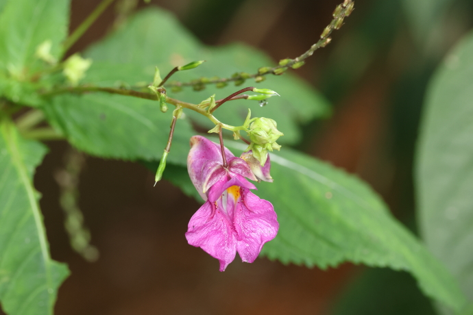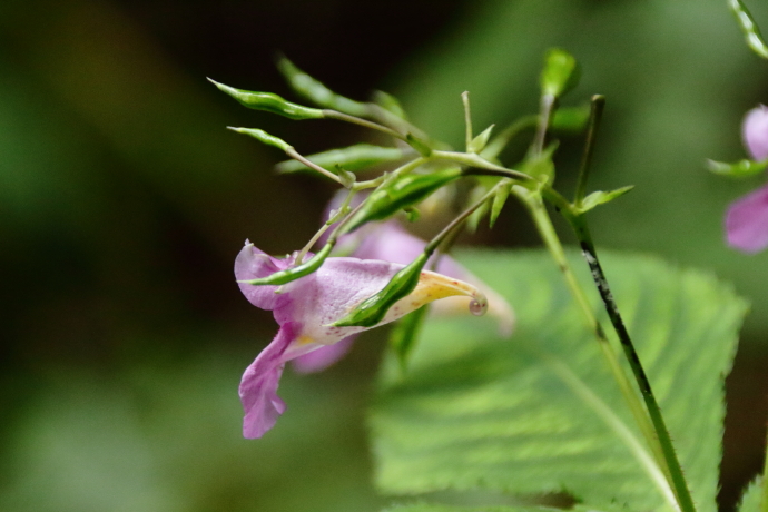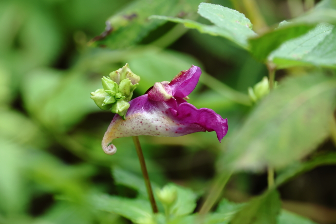 萼片は3枚あり、2枚の小萼片を載せた下萼片は袋状の距となり、先端が巻いて蜜を蓄えます。花弁は5枚で、1枚は上側に位置し、合着した側花弁2枚が左右下へ突き出します。