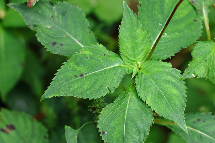 葉は互生し、菱状楕円形で、先端は尖り、基部は楔形です。縁には細かい鋸歯があります。葉は茎の先端側に集まってつく傾向があり、上から見ると輪生状に見えます。
