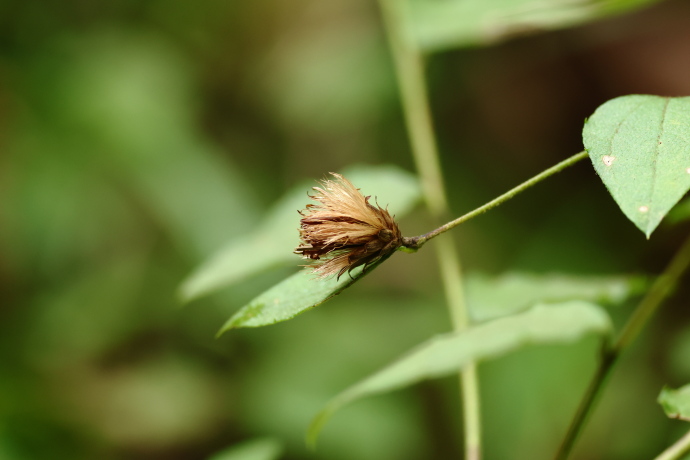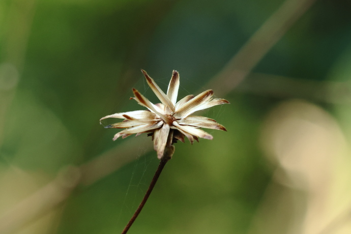 咲いている花の傍らに、綿毛に覆われた花がありました。綿毛は白色~淡褐色で、総苞片が広がっています。綿毛の先端に痩果を付け、やがて風に吹かれて飛んでいきます。