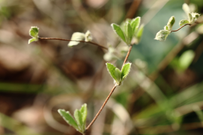葉が展開してきました。白い短毛に覆われた新葉が、森冠の隙間から差す光に照らされ、輝いています。茎も多くの毛に覆われ、触れるとざらついた質感があります。