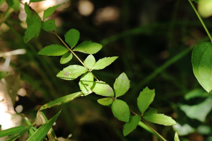 こちらが2年枝の葉です。節ごとに細長い葉が3~4枚ずつ束になって生じます。毛は少なく、花は咲きません。秋に枯れるため、枝が3年目まで残る例はほとんどありません。