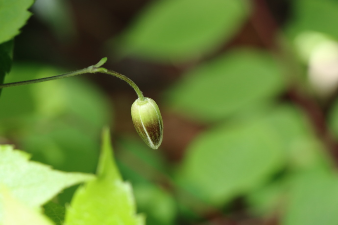 風通しの良い半日陰の林縁で、蕾を見つけました。葉腋から長い花柄が伸び、その先に蕾が一つ、下向きに付いています。花柄の中ほどには、小さな一対の小苞が見られます。