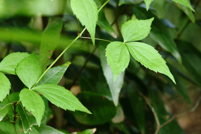 葉は3出複葉で、対生に付きます。他の草木に絡みつきながら伸び、小葉の先は尖り、縁には粗い鋸歯があります。少し環境が変わったのか、ここ数年は花を付けていません。
