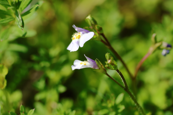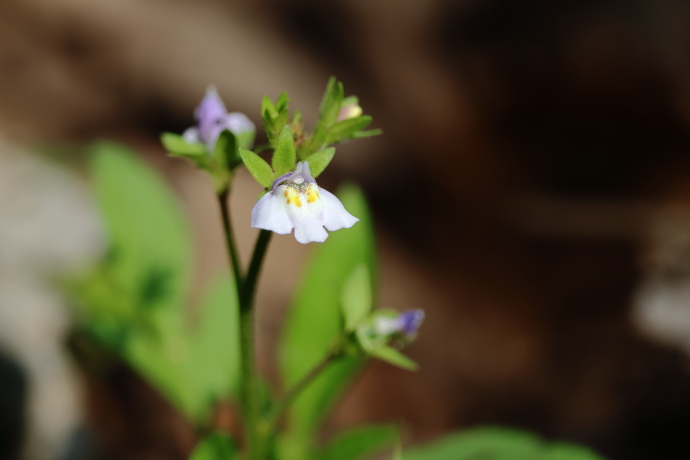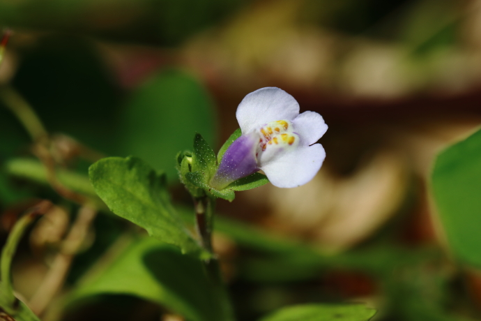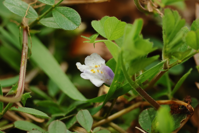 茎頂に総状花序を形成し、唇形花を咲かせます。上唇は淡紫色で小さく、浅く2裂します。下唇は白くて大きく、先端は3裂し、中央は隆起して黄色と赤褐色の斑紋が入ります。