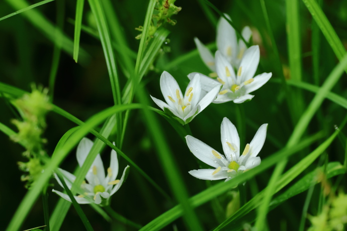 茎の先に散房状の総状花序をつけます。下から出る花ほど花柄が長く、高さが揃っています。アマナは花茎の先端に1個の花をつける単頂性であり、ここでも識別できます。