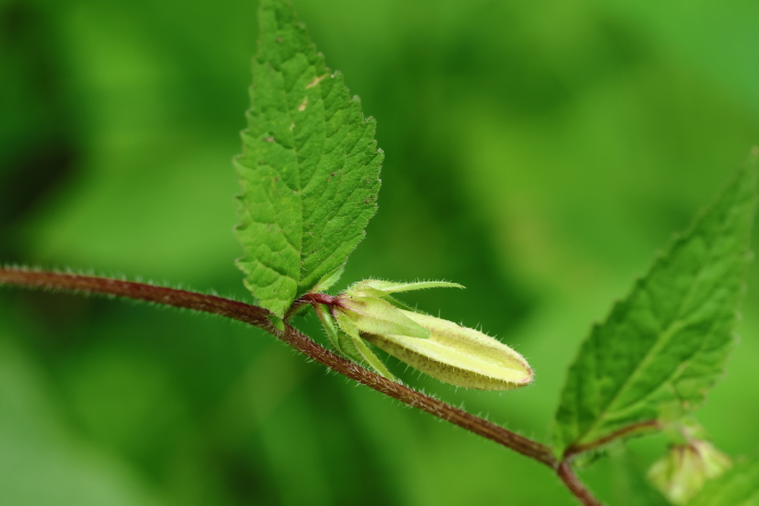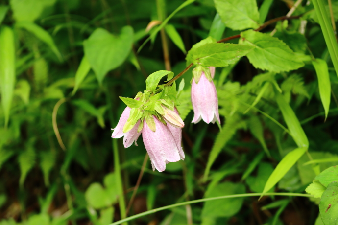 花茎を伸ばし、釣鐘型の花を下向きに咲かせます。茎だけでなく、萼片や蕾にも毛が密生します。萼片の湾入部が反り返り、変種のヤマホタルブクロと識別できます。